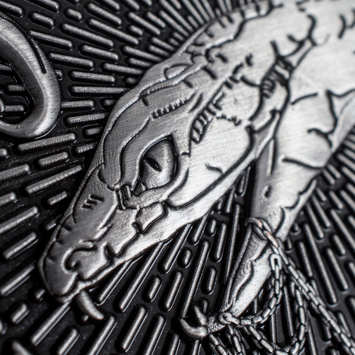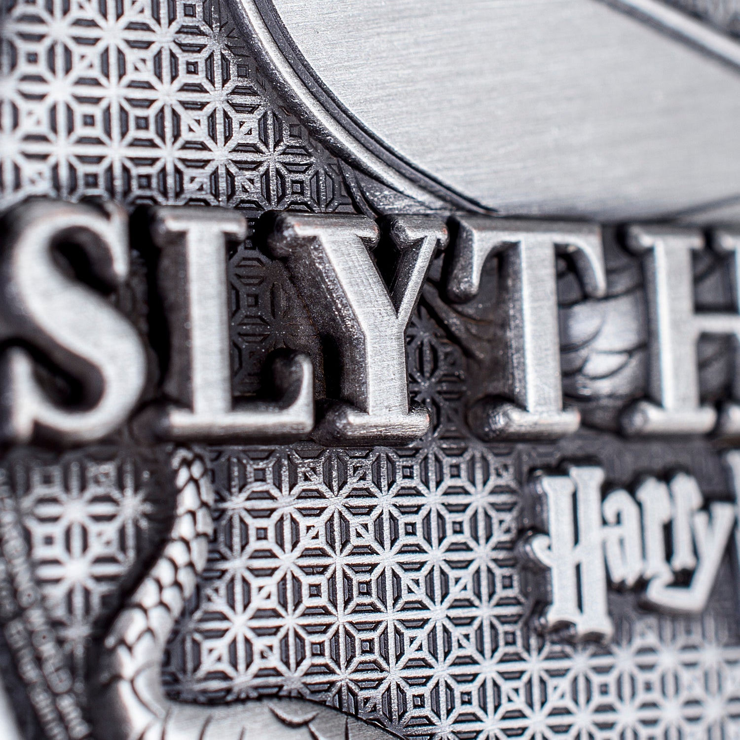 The front of the coin depicts a snake coiled & draped gracefully around the border. In its mouth it holds Salazar's locket. On the back of the coin the majestic reptile can be seen is coiled around the Slytherin S. Around the circumference of the coin is a regal floral design and across the top is a plate with the official identification number, denoting this limited edition collectors piece as one of a kind.