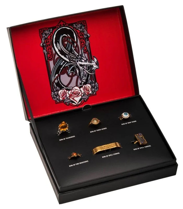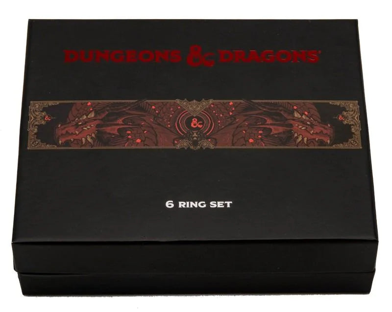 The Dungeons and Dragons Ring Set is perfect for dedicated Dungeon Masters! Utilize the six rings in this collection to your advantage. This six-ring set, with highly detailed accents, is perfect to wear to your next big campaign or for everyday wear. It also comes in an attractive display box, along with a numbered certificate of authenticity. Perfect for anyone who loves D&D!