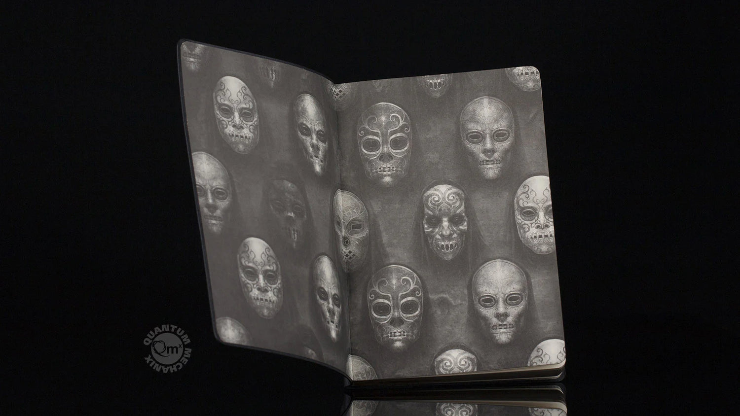 A squadron of powerful Death Eater masks line the front and back covers, ready to defend your pages against do-gooder wizards and curses alike!
