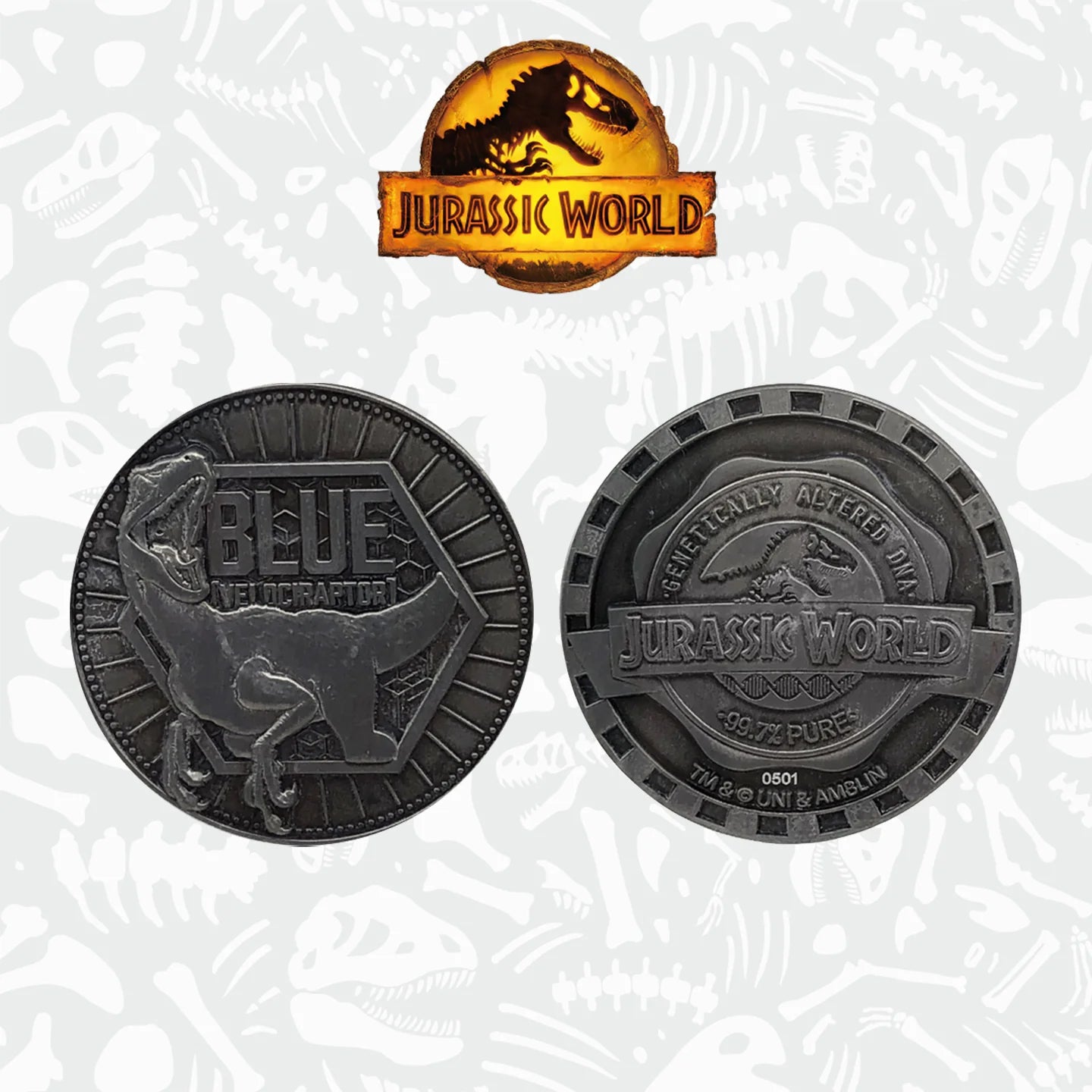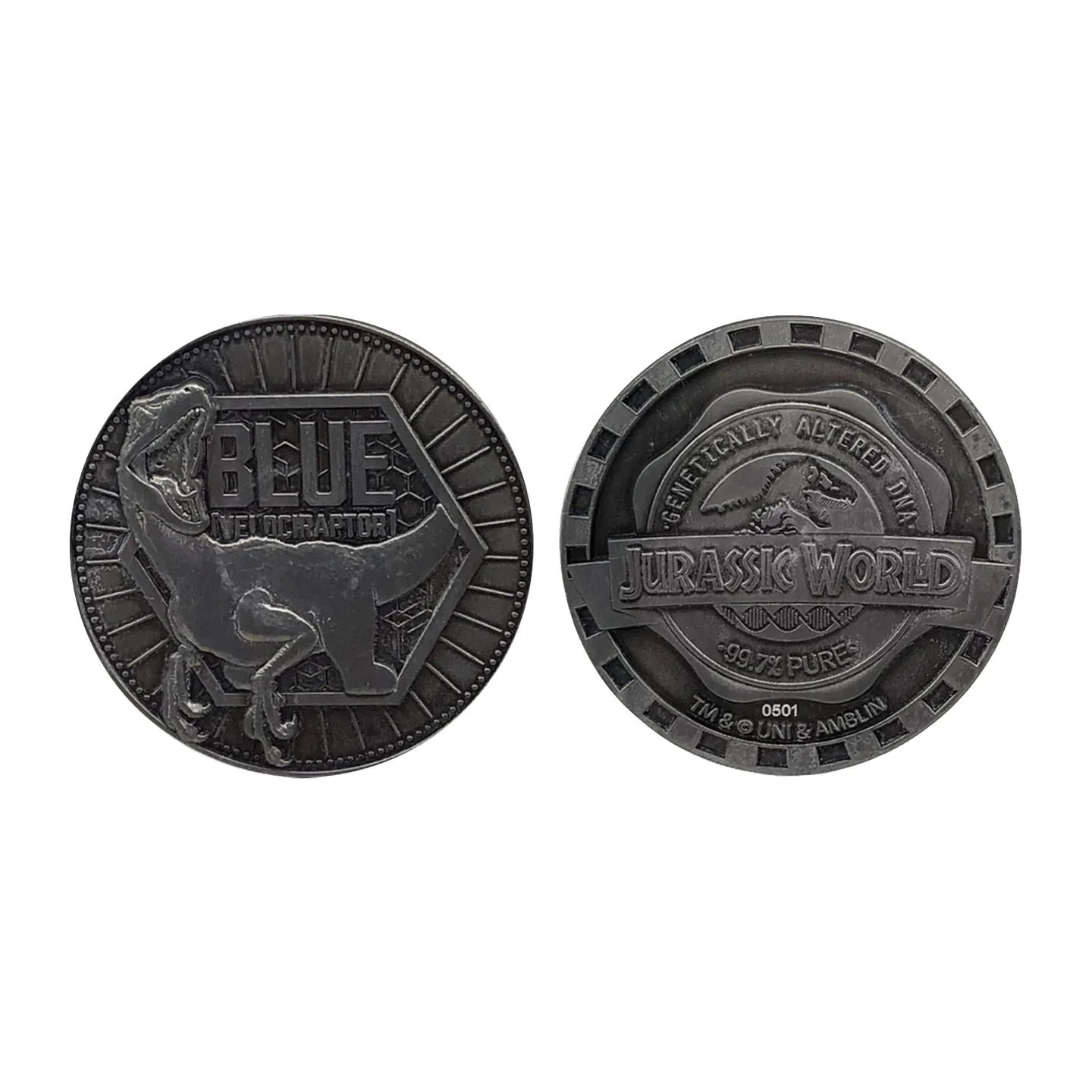 Blue can be seen on our Jurassic World embossed double-sided coin. Limited to only 9,995 worldwide and individually numbered, this coin is 38mm in diameter and supplied within a protective acrylic cup within its display pack. The re-sealable packaging that the Coin comes in is made in the UK from recycled material and is also fully recyclable.