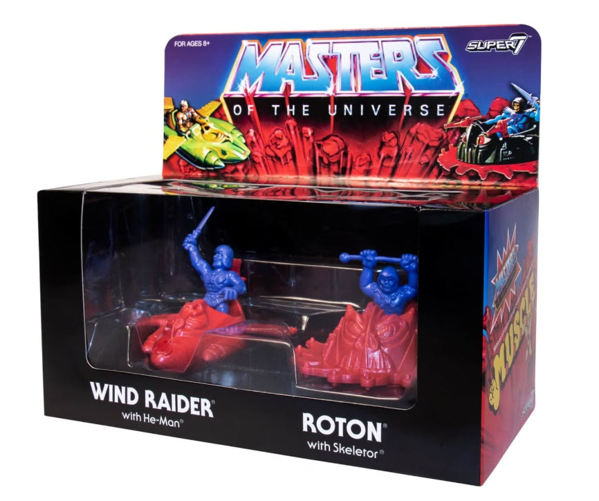 These are the Zavvi exclusive colour variants of the Masters of The Universe figures by Super7. This box set features exclusive Red/Blue never release M.U.S.C.L.E. 4-pack of the Wind Raider with He-Man and Roton with Skeletor.