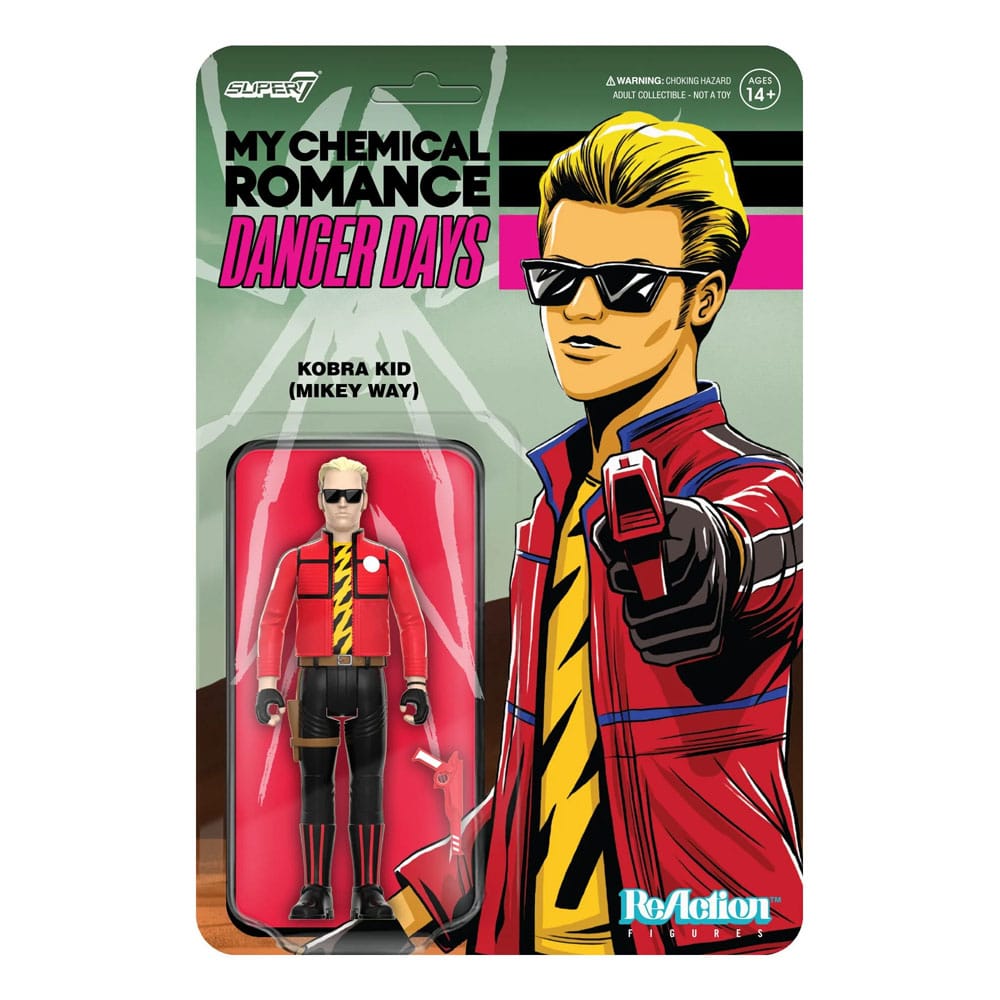 With signature red jacket and yellow shirt, The Kobra Kid stands out in any crowd, especially among the Killjoys! This articulated, 3.75" scale My Chemical Romance ReAction Figure of The Kobra Kid is inspired by Mikey Way's Killjoys alter ego from the MCR album "Danger Days: The True Lives of the Fabulous Killjoys" and comes with ray gun accessory. Continue the struggle against Better Life Industries by adding The Kobra Kid ReAction Figure to your collection!