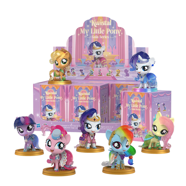 Join Equestria's biggest party, the illustrious Grand Galloping Gala, through this mesmerizing Kwistal Fwenz series! This collection showcases six magnificent ponies, each dressed in their most exquisite attire, with the enchantment of their magic brought to life in Kwistal form. Each collectible also features the cutie marks of each respective pony, adding a touch of charm to them.