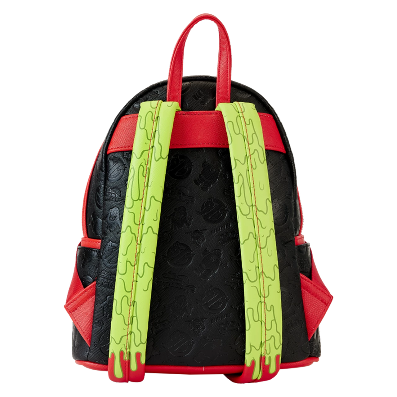If paranormal activity suddenly materializes during your journeys, gear up! Prepare for adventures with our Loungefly Sony Ghostbusters Logo Mini Backpack. This spirited accessory features a fully figural, circular front-zipped pocket, displaying the classic movie logo. In the dark, the ghost in the middle of the red "no ghost" sign glows! An all-over debossed print includes a motif of patterns of familiar images from the movie, including the marshmallow mascot, an encore appearance of the classic movie logo, and other surprises. Over the straps, a mysterious green slime adds a wickedly fun touch. Pack your ghost traps and proton packs in style! Backpack features include silver-colored metal hardware, adjustable straps, vegan leather (polyurethane), side pockets, and applique, debossed, glow-in-the-dark, and printed details. Note the coordinating lining. This backpack is an officially licensed Sony product. Backpack dimensions: 9" W x 10.5" H x 4.5" D