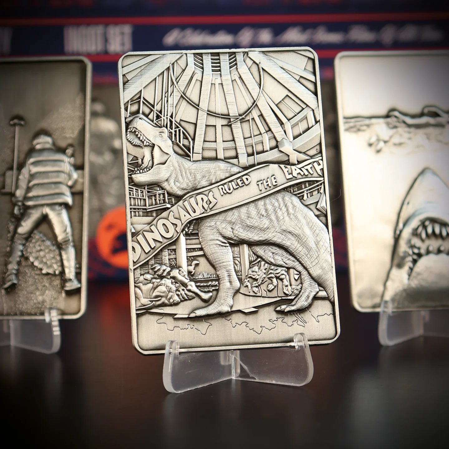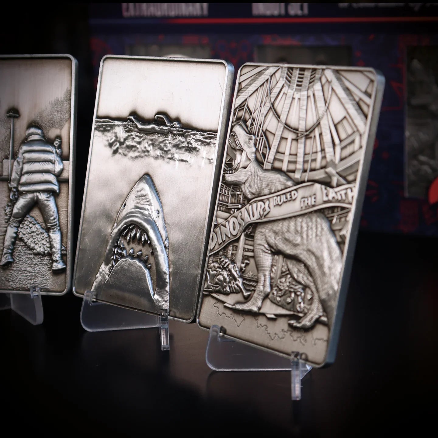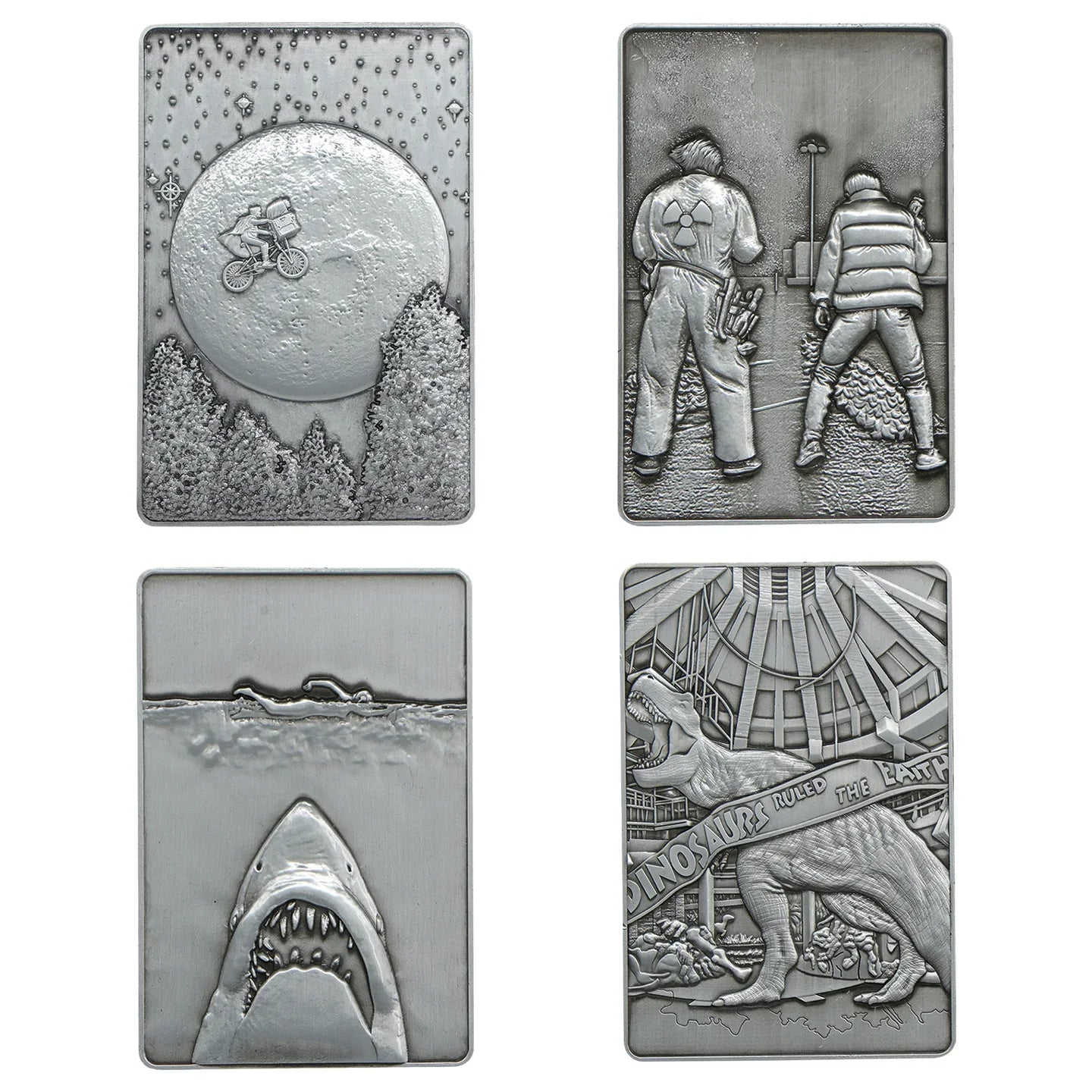 Four heavily embossed metal Ingots featuring Back to the Future, E.T. The Extra-Terrestrial, Jaws & Jurassic Park. All of the Ingots come with individual display stands and the set is individually numbered and limited to 5,000 worldwide.