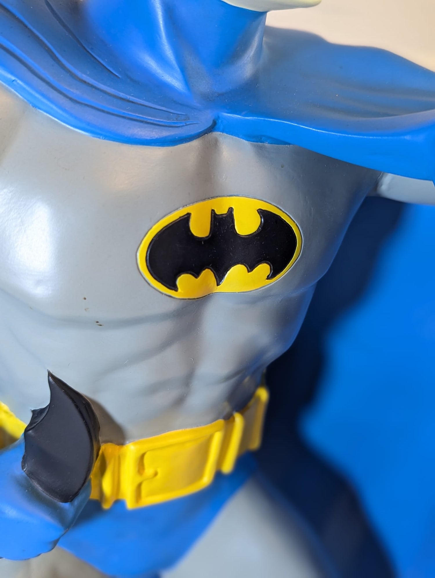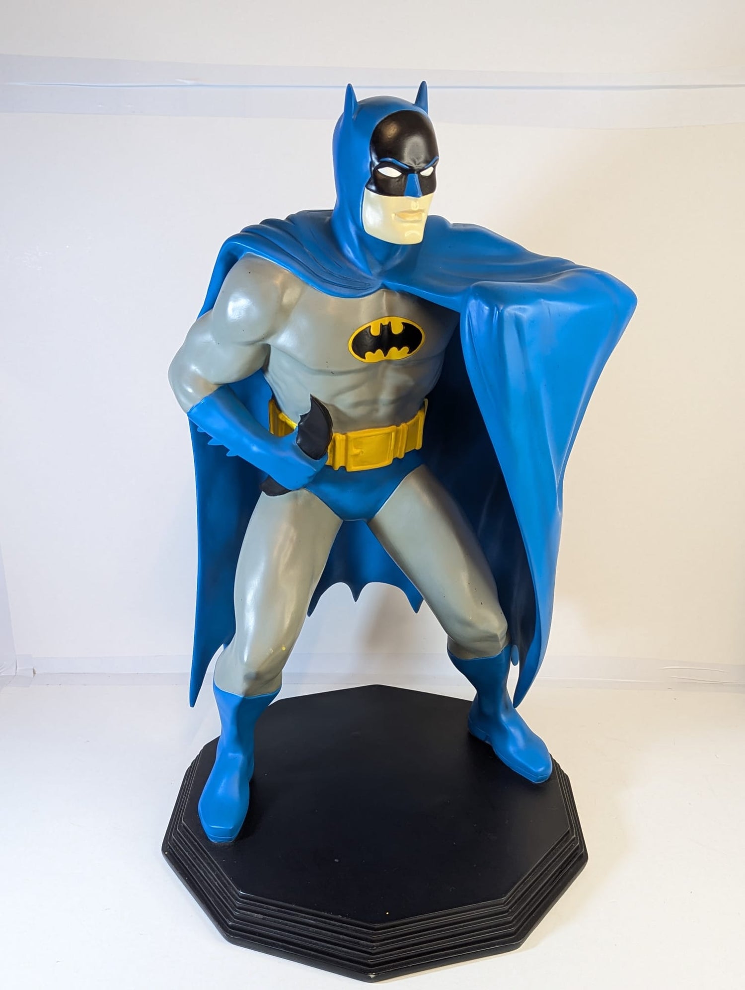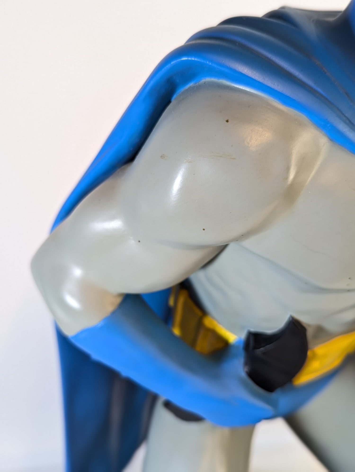 Add a touch of the Caped Crusader to your collection with this Warner Bros. Studio Store Batman figurine from 1999. Measuring at 55cm, this 1:4 scale sculpture is made of high-quality resin and features an expertly painted design that beautifully captures the essence of the iconic superhero. This statue was originally displayed in Warner Bros. Studio Stores and would make an amazing piece to display in your Batman collection!