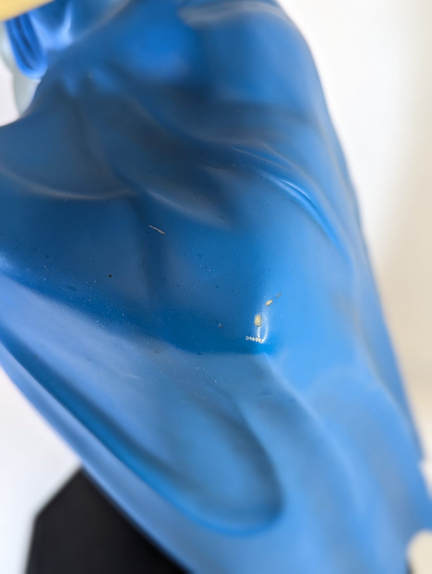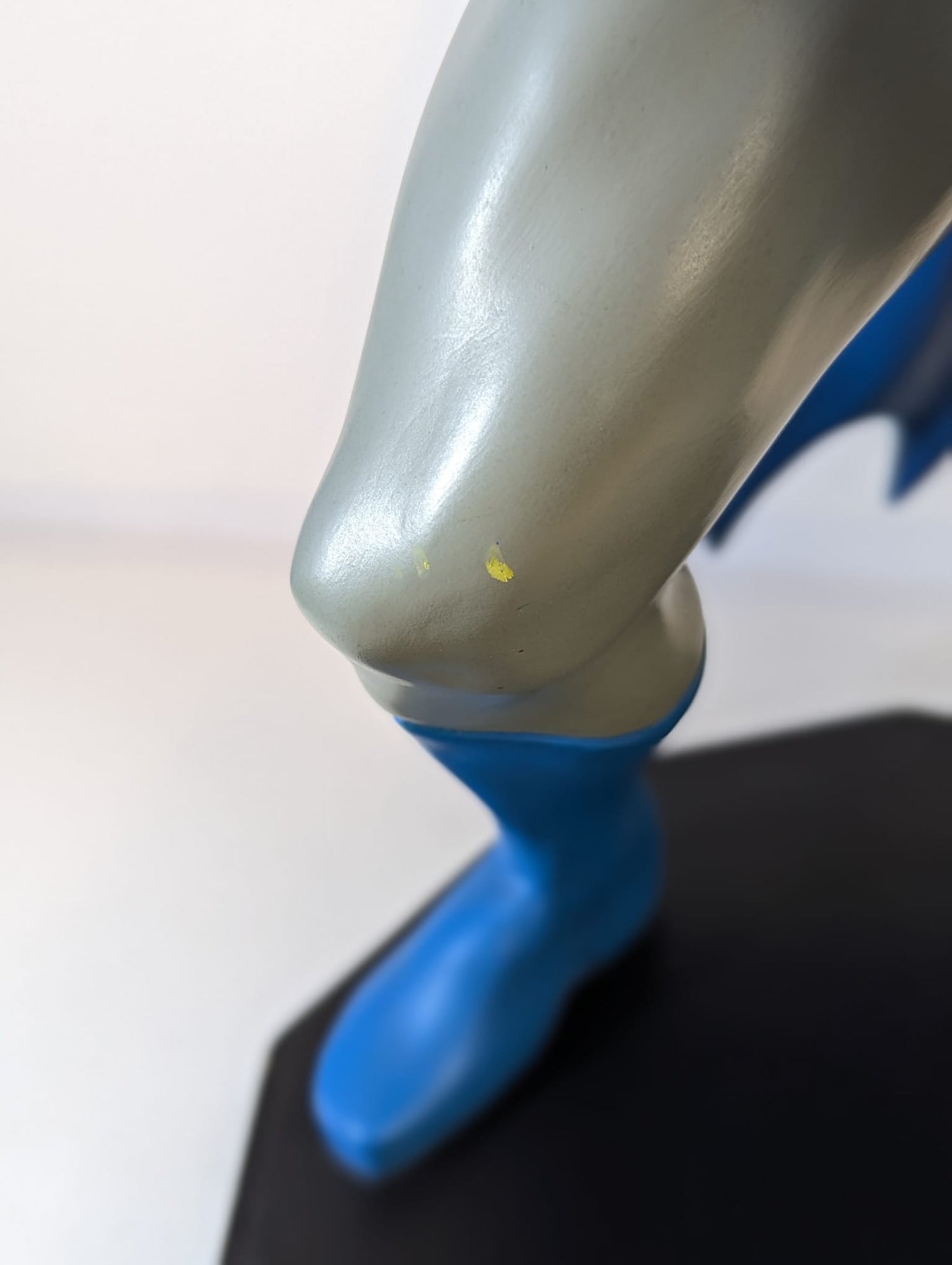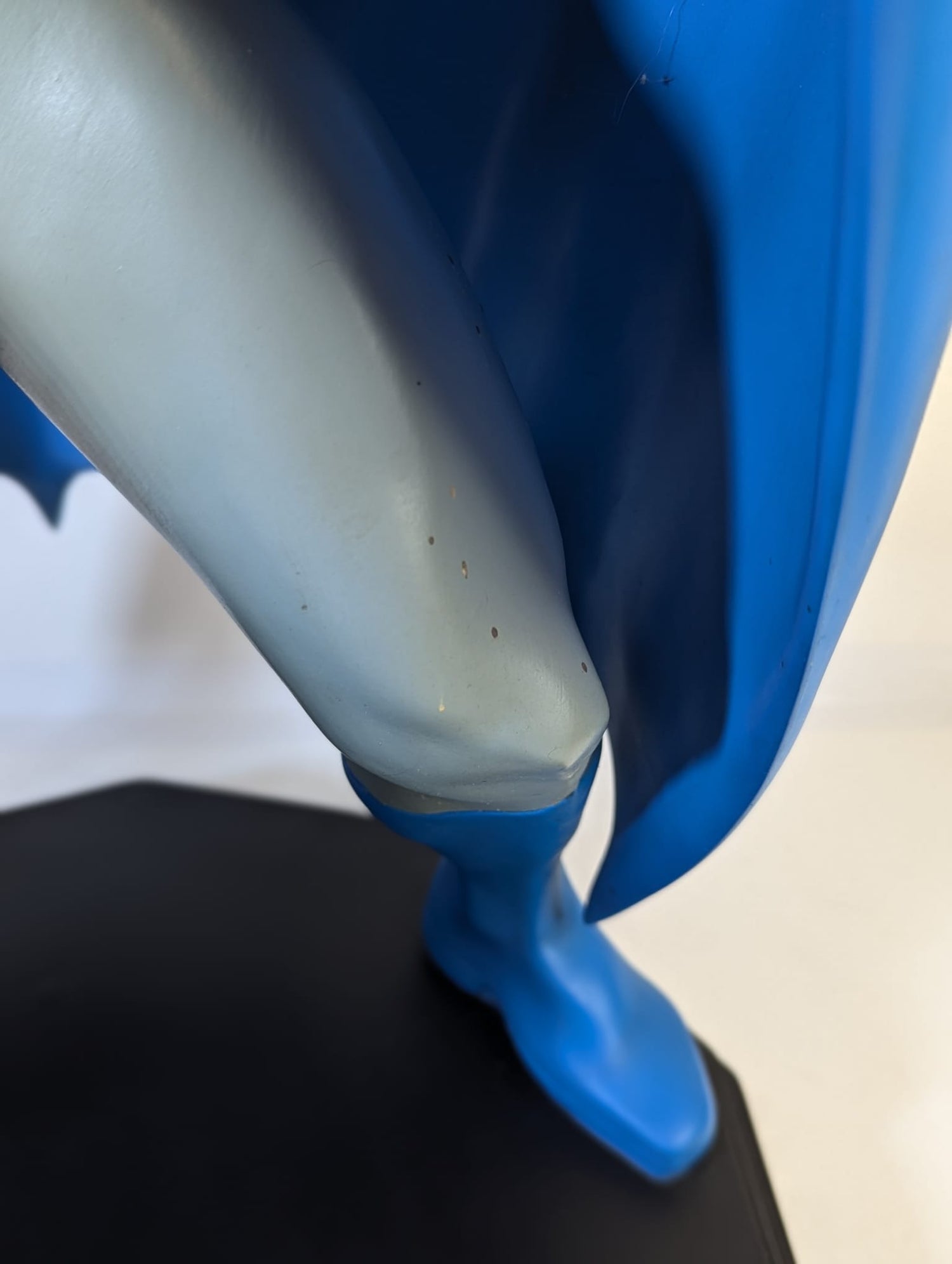 Add a touch of the Caped Crusader to your collection with this Warner Bros. Studio Store Batman figurine from 1999. Measuring at 55cm, this 1:4 scale sculpture is made of high-quality resin and features an expertly painted design that beautifully captures the essence of the iconic superhero. This statue was originally displayed in Warner Bros. Studio Stores and would make an amazing piece to display in your Batman collection!
