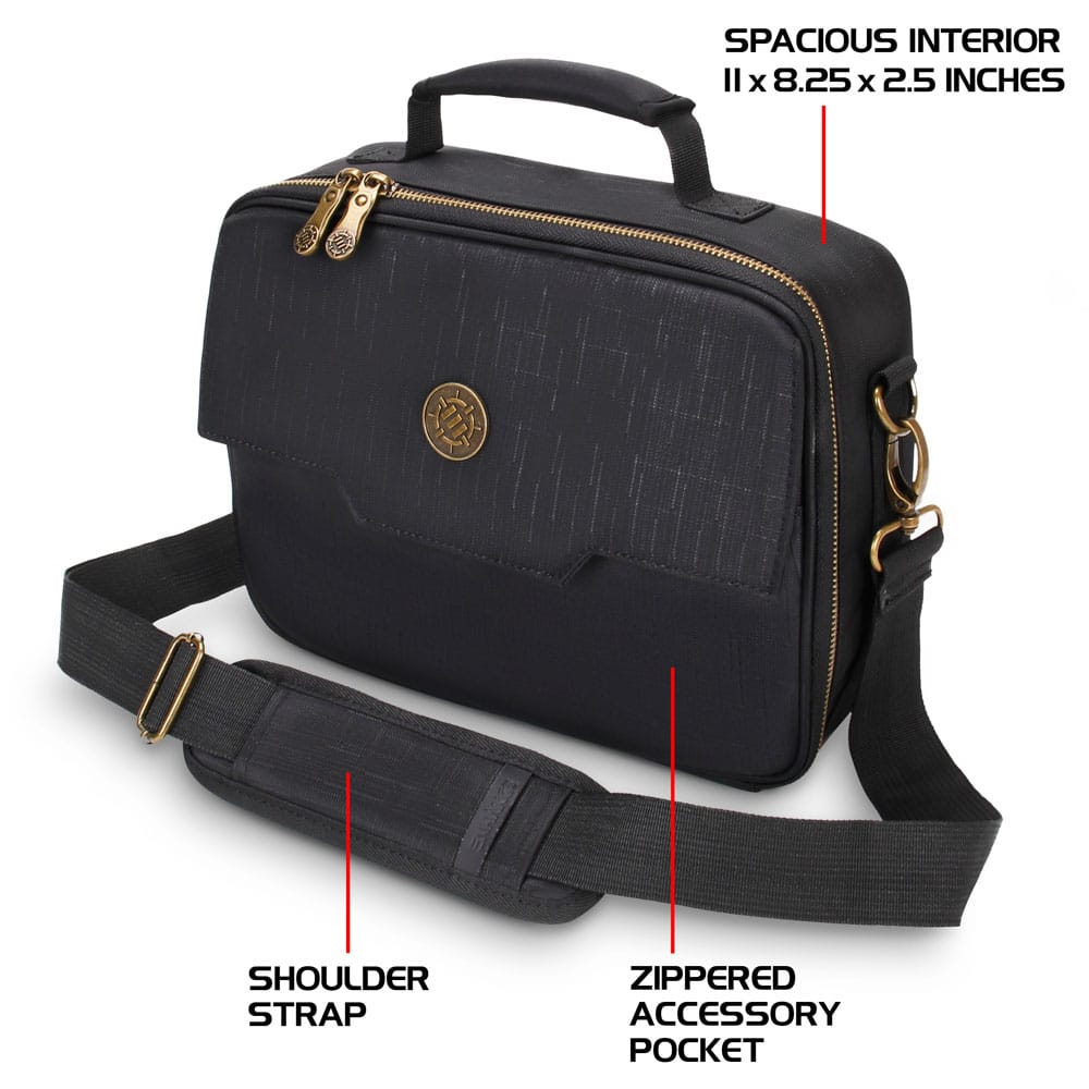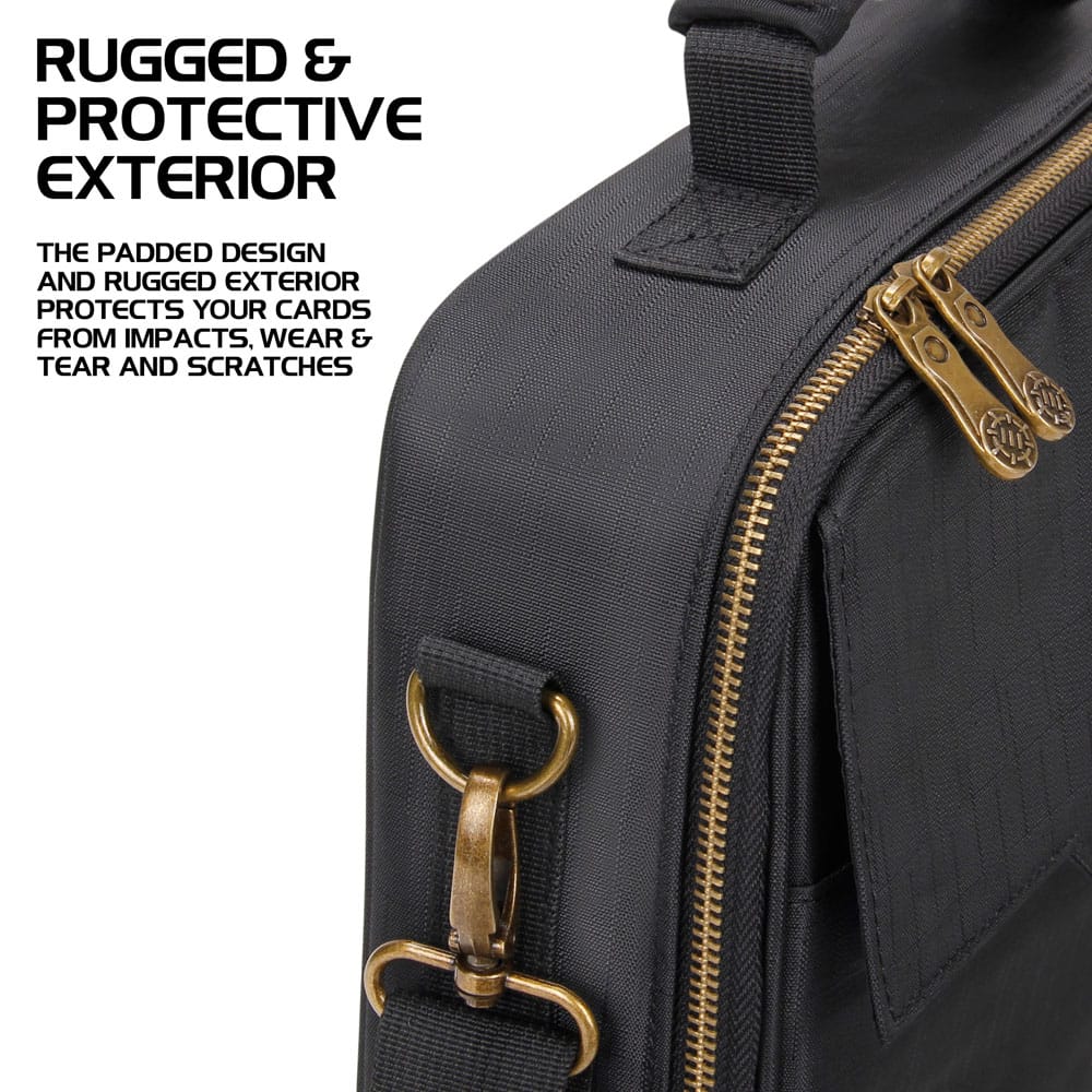 A modern design with brass colored hardware and zipper pulls with a deep black textured exterior offers a professional appearance for tournament events. The interior is entirely adjustable with 7 removable dividers to create custom sized compartments for Ultra Pro deck cases, loose sleeved cards, BCW cardboard storage boxes, and much more.
