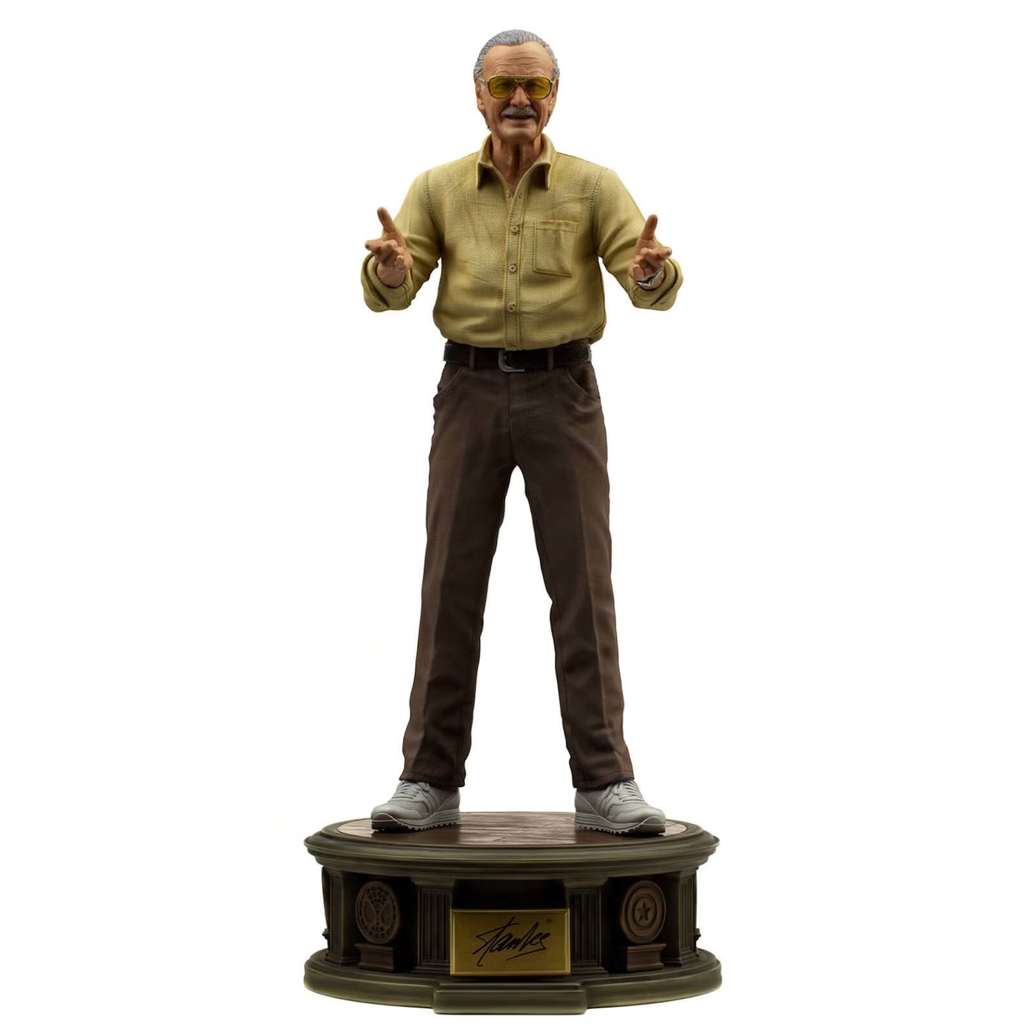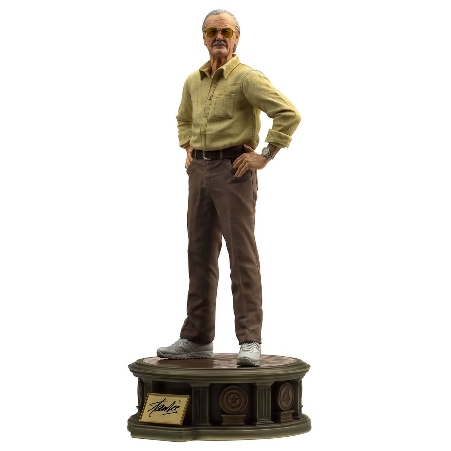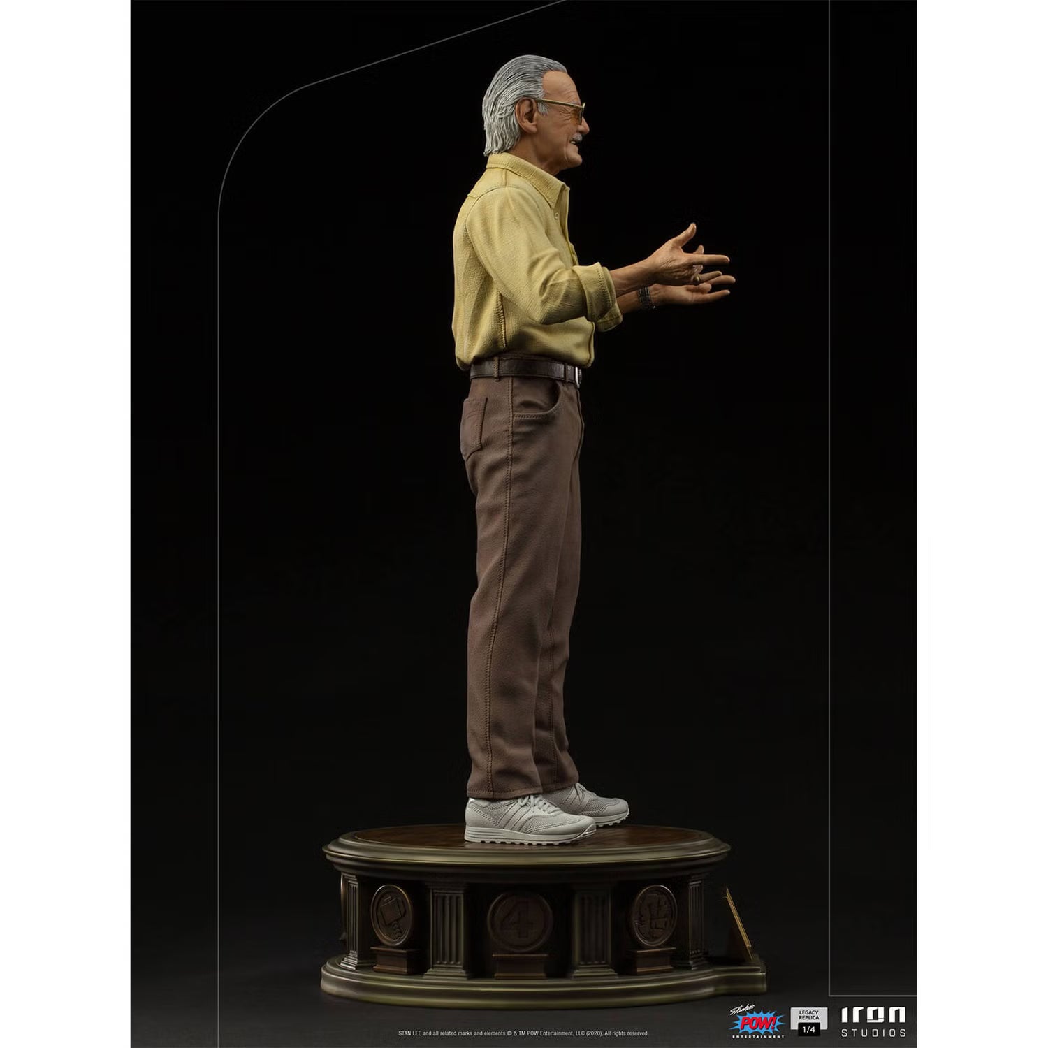 - A figure in the impressive 1/4 scale, on a luxurious base with adornments around it, reminiscent of several of his most famous creations and a front plate with his unmistakable signature, which accompanied us in the comics. The statue also has two pairs of arms and two interchangeable heads for different presentation poses, with the option of his arms extended or around his waist, as he would say, "Stan Lee presents:"!