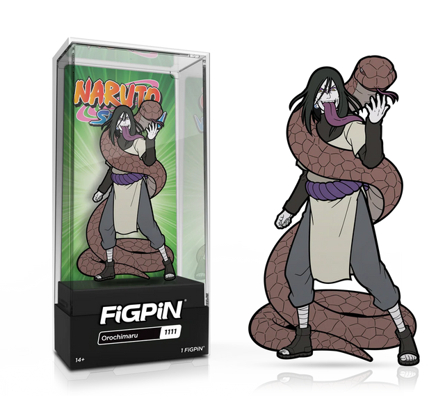 From Naruto: Shippuden comes the serpentine shinobi, Orochimaru! This Naruto: Shippuden Orochimaru FiGPiN Classic 3-Inch Enamel Pin is #1111 in the collection. The premium hard enamel 3-inch tall FiGPiN is amazingly detailed and is able to stand up with the signature FiGPiN rubber backer stand. The pin comes displayed in front of a backer card and is fully encapsulated in the ultra collectible FiGPiN clear protector case.
