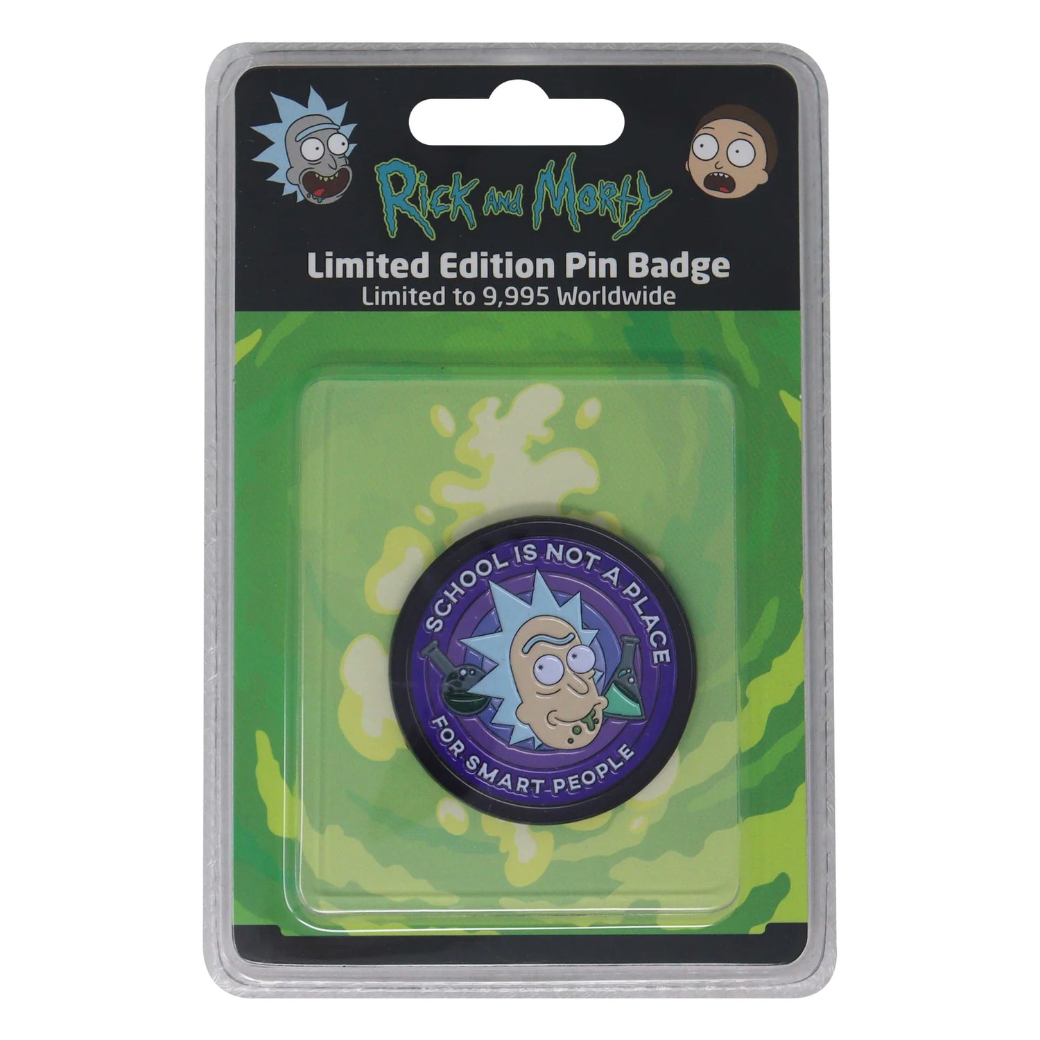 'School is not a place for smart people'. Join the Rick Sanchez team with this Limited Edition Pin Badge. Depicting this hilarious quote and Rick's face, this Pin Badge is limited to 9,995 worldwide with each item being individually numbered on the reverse.