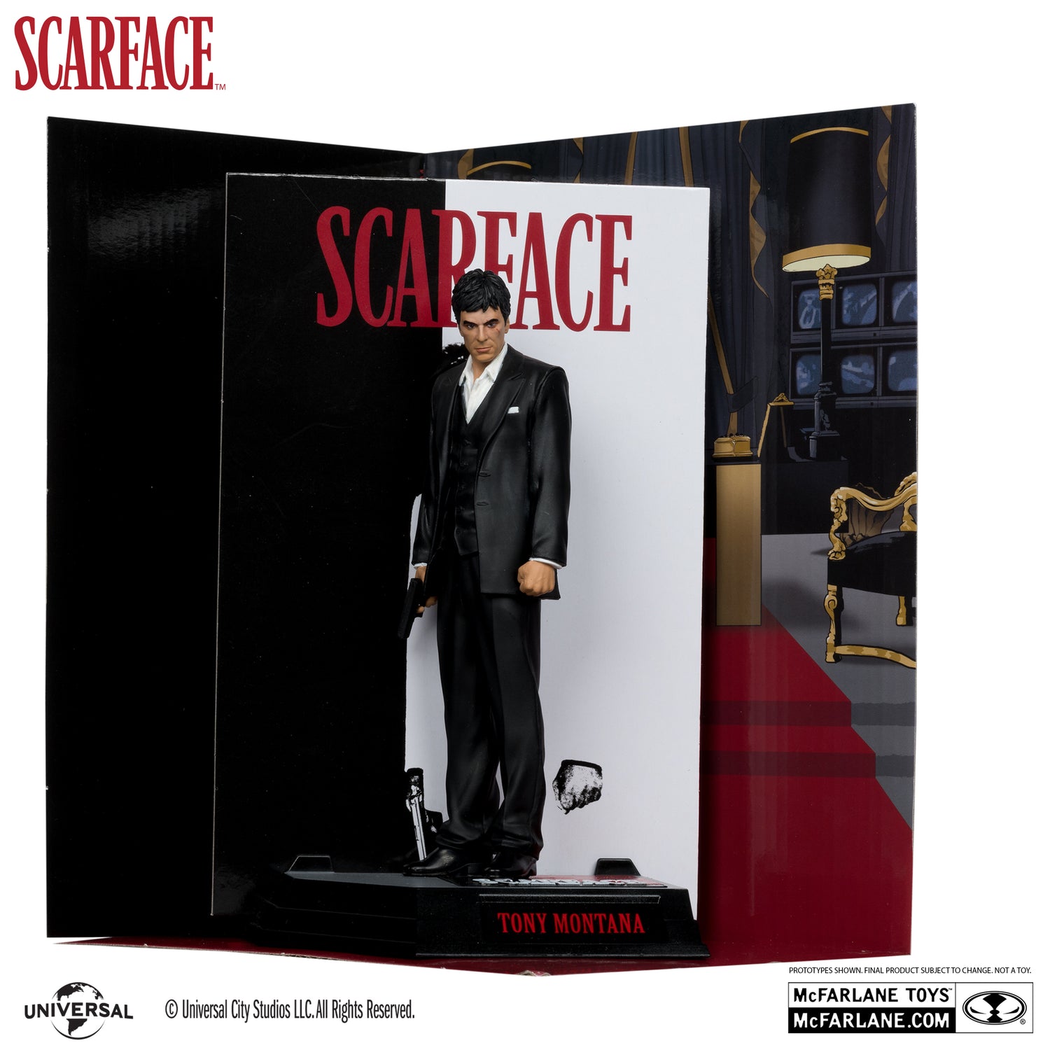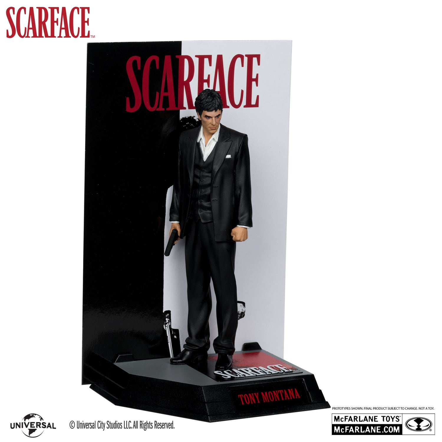 Say hello to your new little friend! The Movie Maniacs Universal Wave 4 Scarface Tony Montana 6-Inch Scale Posed Figure is based on the 1983 theatrical classic Scarface. This figure features the likeness of Al Pacino and comes with a scenic printed backdrop, environmental base, a collectible art card and a certificate of authenticity. Packaged individually in window box, this limited-edition posed figure also comes with a secret bonus item. This Movie Maniacs Universal Wave 4 Scarface Tony Montana 6-Inch Scale Posed Figure is limited to 6,350 units. Comes individually numbered. Ages 17 and up.