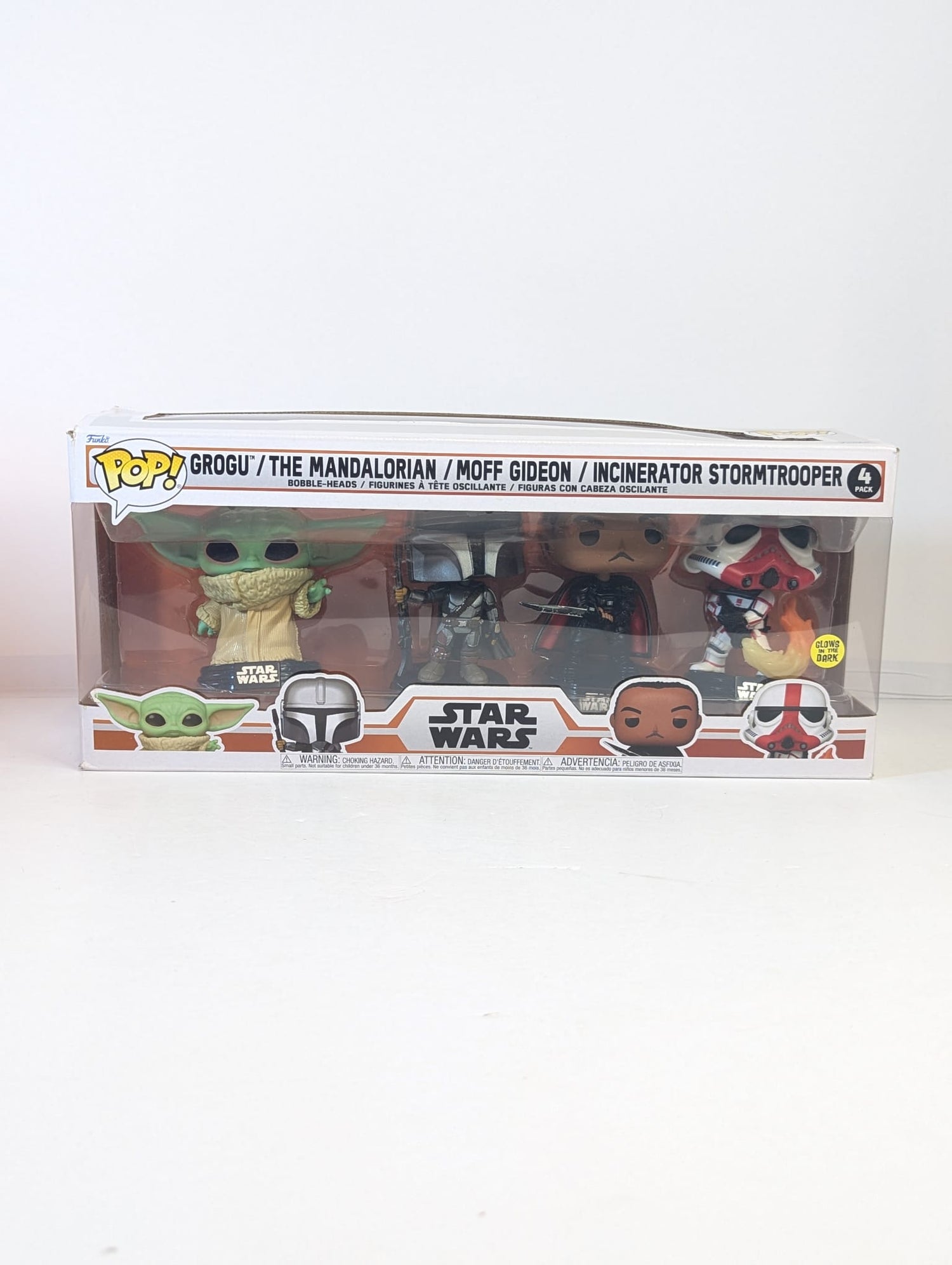 This Pop! 4-Pack features four of your favourites including The Mandalorian, Moff Gideon, Grogu (The Child) and an Incinerator Stormtrooper who Glows in the Dark.