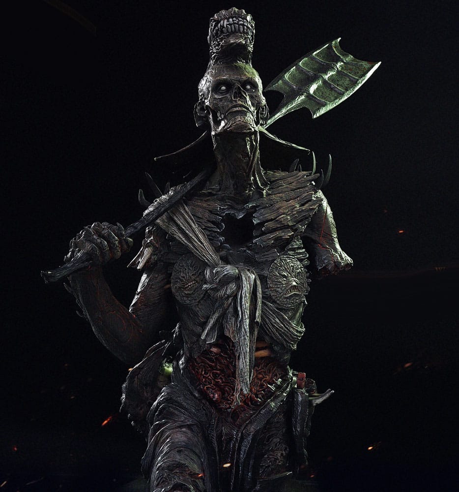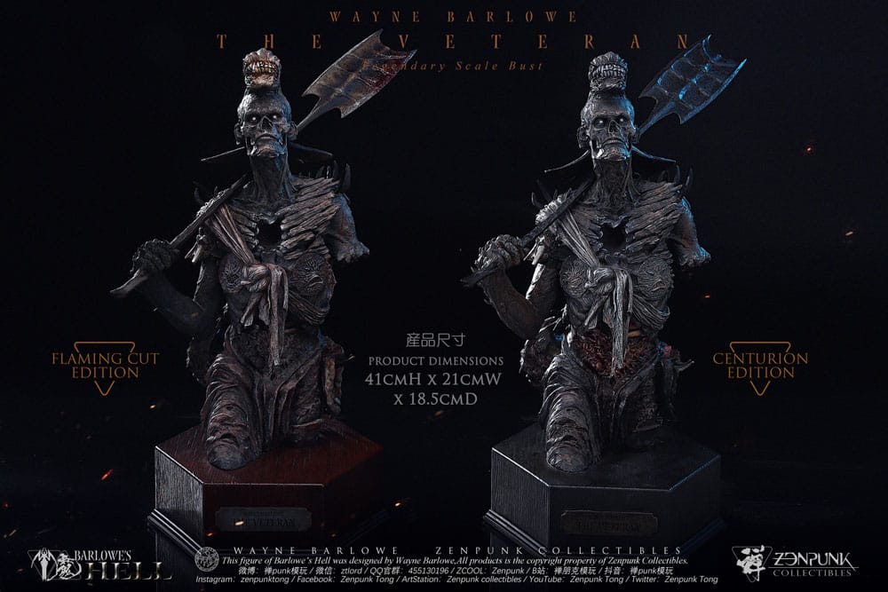 The veteran is one of the representative works of many Hell paintings by dark artist Wayne Barlowe. It depicts a veteran demon soldier, a centurion, who is scarred all over but adorned with trophies of battle. The heart of his chest has been dug by the victors in the battle of rebellion in heaven, leaving a terrible black hole. His shield arm has also been removed in the battle in hell, However, these terrible wounds increased the veteran's sense of vicissitudes. This legendary scale bust comes in two variants, the Centurion edtion features a cool and darker color pallete with a black display base.