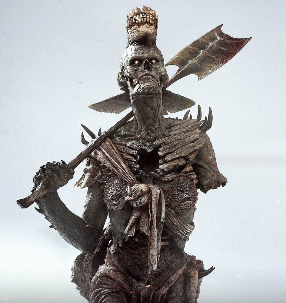 The veteran is one of the representative works of many Hell paintings by dark artist Wayne Barlowe. It depicts a veteran demon soldier, a centurion, who is scarred all over but adorned with trophies of battle. The heart of his chest has been dug by the victors in the battle of rebellion in heaven, leaving a terrible black hole. His shield arm has also been removed in the battle in hell, However, these terrible wounds increased the veteran's sense of vicissitudes. This legendary scale bust comes in two variants, the Flaming Cut edtion features a warm and blood themed color pallete with a brown display base.