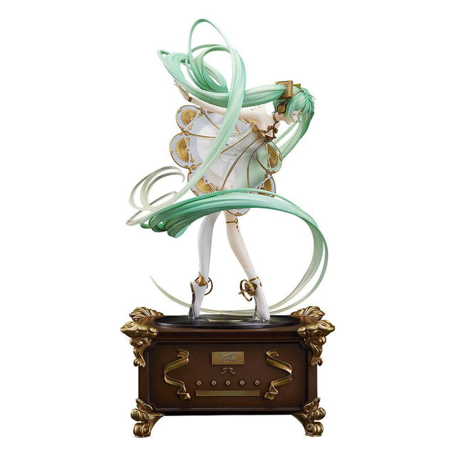 Illustrator Rella's fantastic, beautiful main visual illustration has been carefully brought into figure form. Miku's gramophone-inspired dress features translucent parts and delicate pearl and gold paintwork. In addition to her face with closed eyes, an interchangeable smiling face part is included.