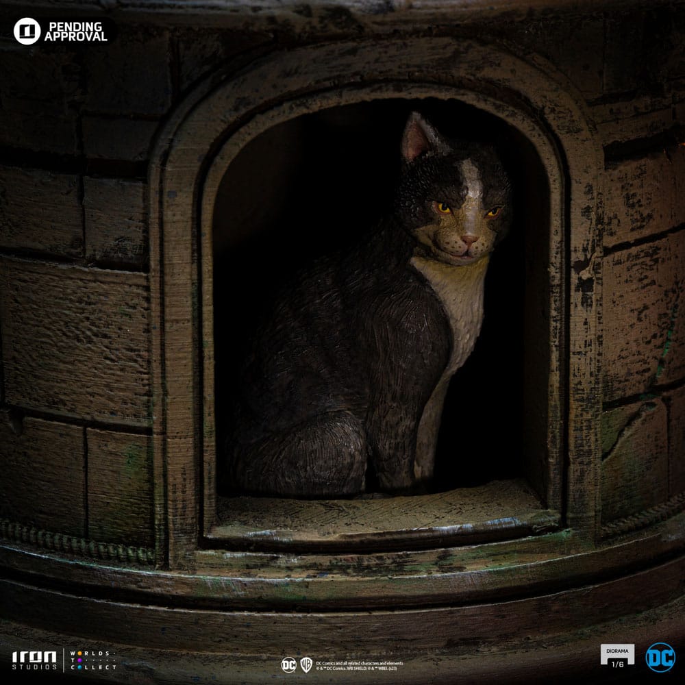 From the top of an old tower in the gloomy city of Gotham, in a tower with medieval architecture, above two peacefully resting kittens, seated on a grey griffon gargoyle, the most emblematic and skillful local thief boasts all her charm over the Dark Knight. Using a black mask and leather costume, with the characteristic details of a cat silhouette on her zipper and on the buckle of her belt, the stealthy feline leans her fearsome whip on her shoulder, and subtly raises her claws, touching the chin of the relentless night defender. By the ornamental stone creature's feet, the hero tries to maintain his typical coldness and inflexible conduct while facing the charming figure, but fails to do so, with a warm heart under the tactical Kevlar mesh of his black and grey costume. With his black cape flapping and simulating big bat wings, Iron Studios bring the statue "Batman and Catwoman - DC Comics Series #9 - Diorama 1/6", with the most passionate, but also complicated couple in DC Universe.