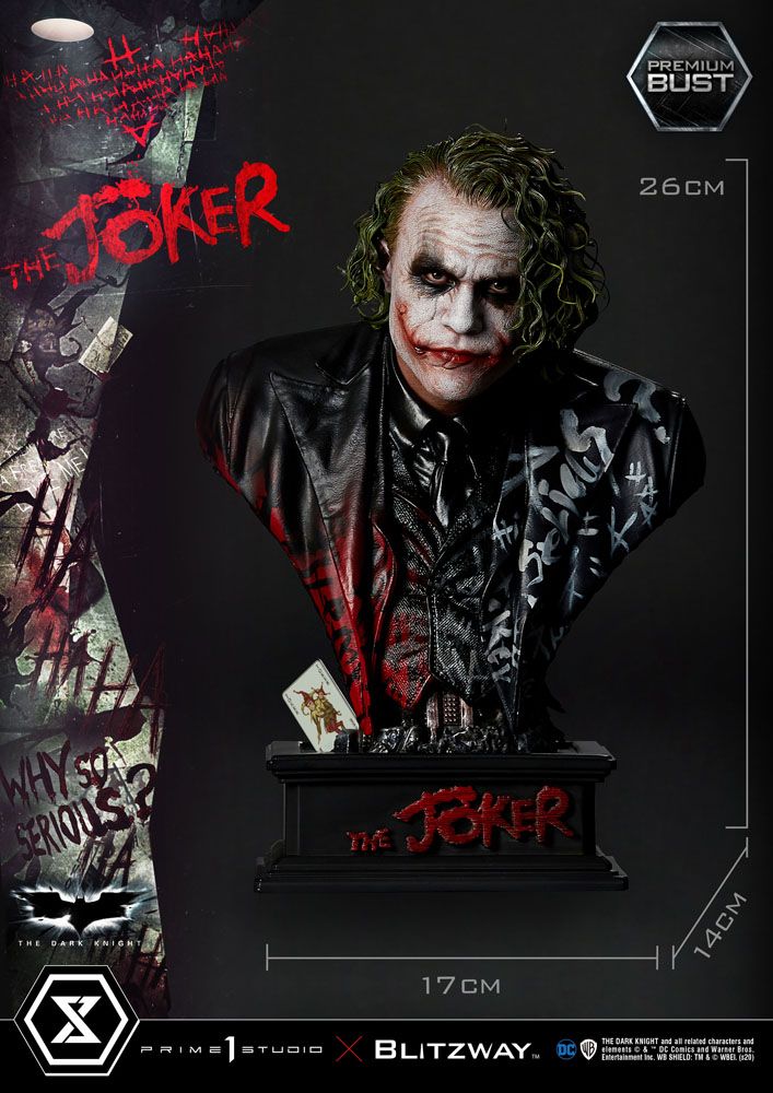 Blitzway has crafted an extremely accurate detailed likeness, life-like hair, and Dark Knight-themed base. In addition, this bust comes with the Playing Card from Batman Begins and the Joker portrait, which are compatible with our MMTDK-01/01S The Joker 1:3 Scale Statue!