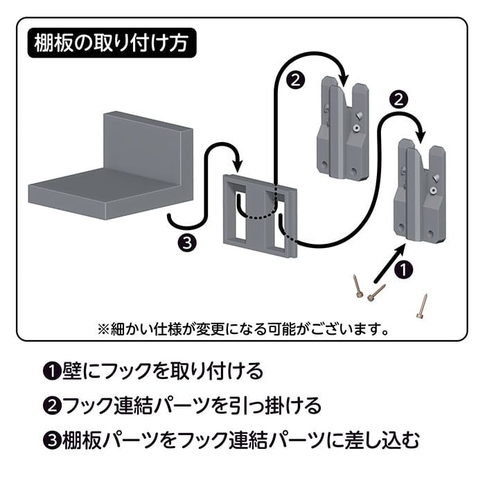 The special wall shelf is designed to be hooked onto the wall by attaching the fixture with thin pins, making the installation holes less noticeable. Lightweight items can also be displayed on top of the shelf.