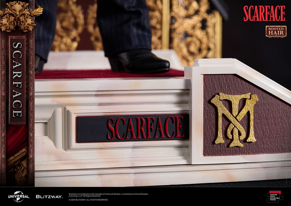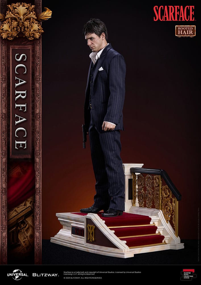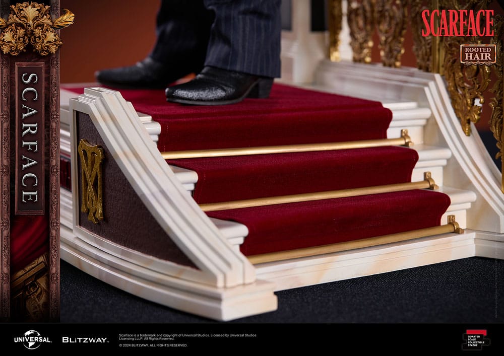 Pacino's commanding presence and intense gaze, masterfully depicted in "Scarface," are meticulously recreated through resin head sculpts and Blitzway's eye insertion techniques. This figure encapsulates Tony Montana's journey of moral decay amidst his escalating pursuit of success, accentuated by opulent suits and a diorama base representing a pivotal scene from the film. With lavish golden railings, plush red carpet stairs, and Tony Montana's poised figure, Blitzway's "Scarface" captures the nuanced moments of contrast in his expressions. Available in both Standard and Rooted Hair Versions.