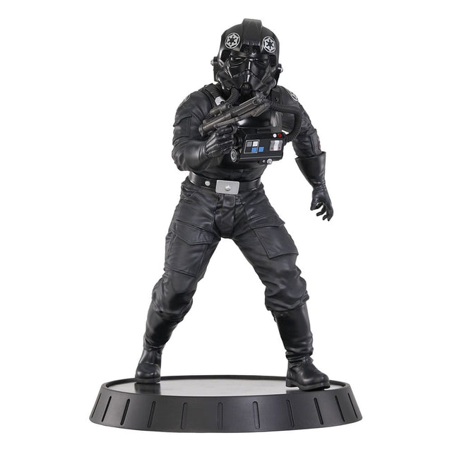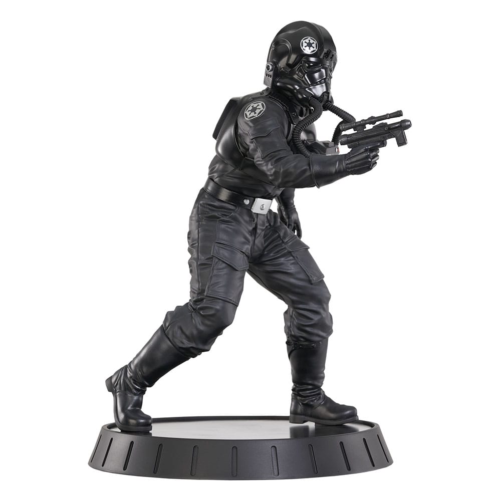 A Gentle Giant Ltd. Release. Move over, stormtroopers -- it's the TIE Pilot's time to shine! This 1/6 scale statue of an Imperial TIE Fighter Pilot depicts him dashing to his fighter so he can engage the enemy. Measuring approximately 12" tall, he carries a small blaster in case he encounters any resistance along the way -- in fact, he has interchangeable E-11 and SE-14r blaster pistols! Limited to only 1000 pieces and hand-numbered on the base, it comes packaged with a matching certificate of authenticity in a full-color numbered box.
