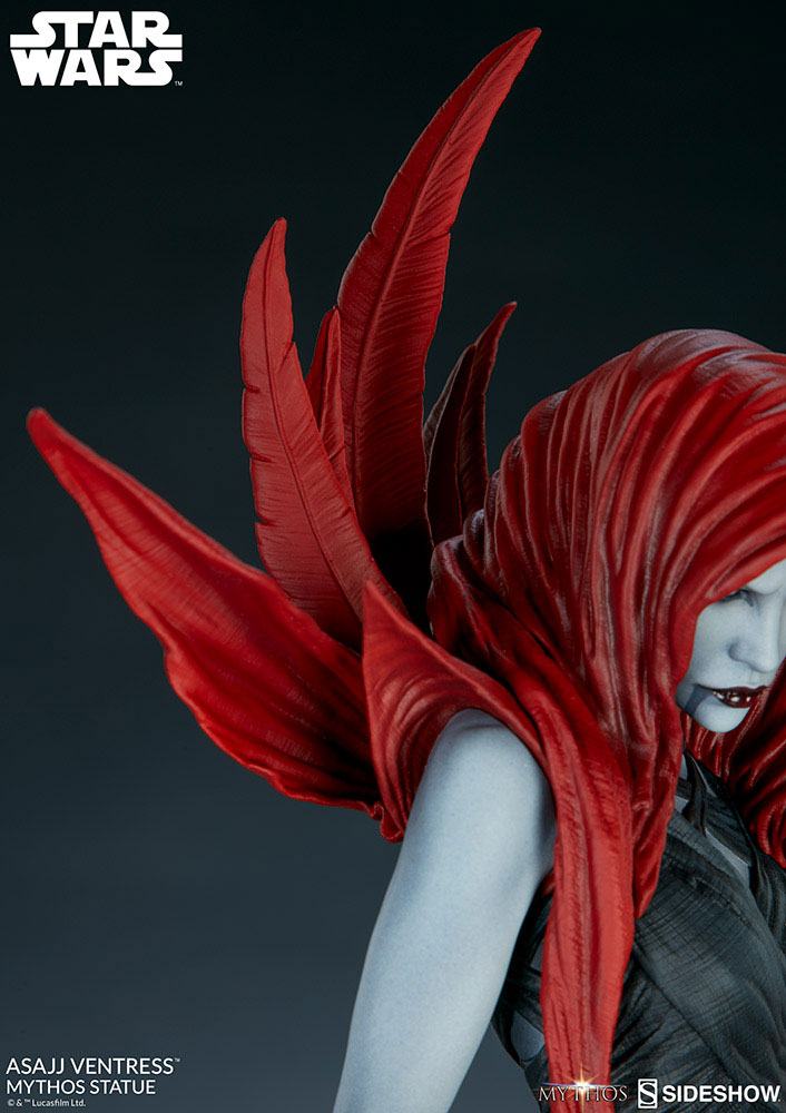 The polystone Asajj Ventress Mythos Statue has PVC elements and features an intricate, fully sculpted costume in the Nightsisters' traditional black and red hues, detailed with realistic and dynamic fabric-like movement. Her black bodice, leg guards, and gloves all have a wrapped and roughened appearance while her red hood, skirts, and the feathers adorning her shoulders are sculpted with dramatic, billowing flow.