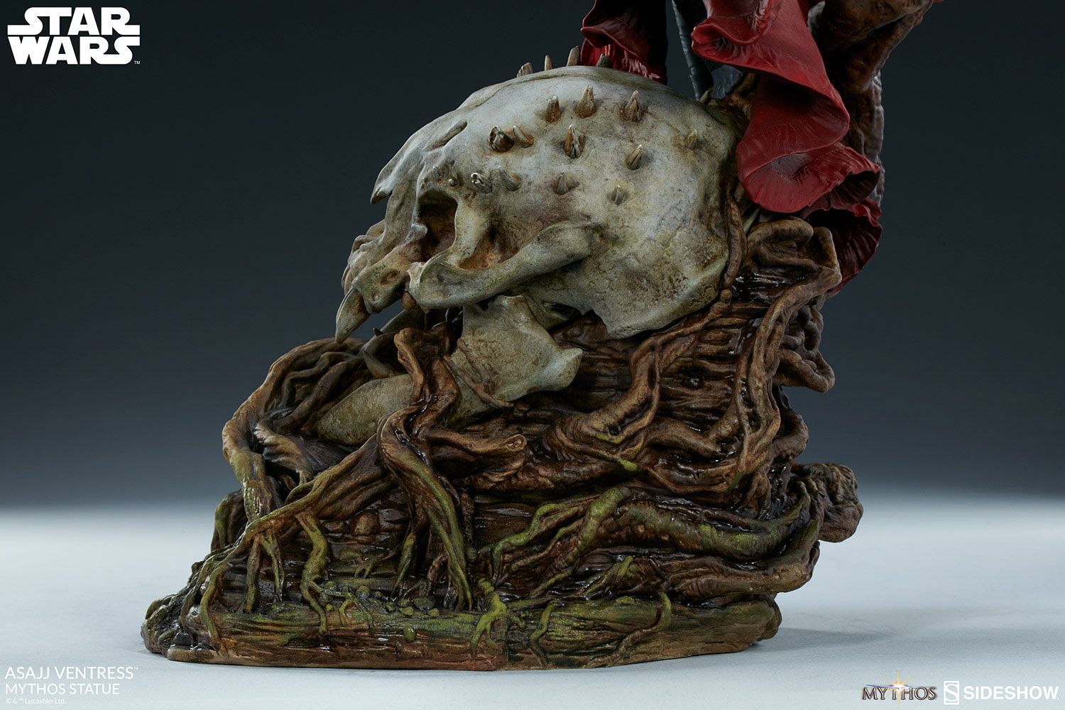 The Asajj Ventress Mythos Statue measures approx. 58 cm tall as the lethal Nightsister stands poised on the growths of a Dathomirian swamp base. Beneath her feet lies a Ssurian skull snared in the vines of her home planet's native flora as the Sith assassin wields her dual red lightsabers in preparation for battle.