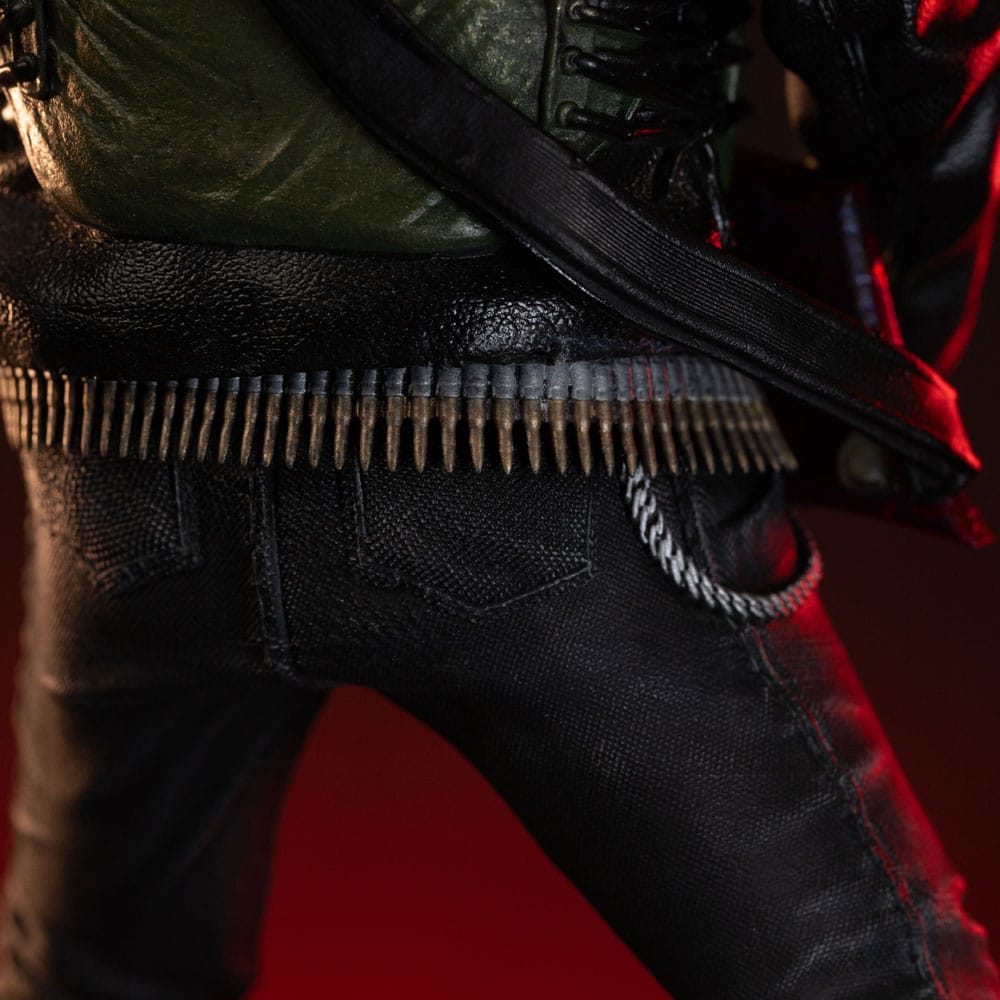 In a mysterious dark and grim alternate dimension existing parallel to the human world, home to a race of humanoid predators and a giant spider-like entity composed of black and silver particles known as the Mind Flayer, a young rebellious guitarist with a passion for Heavy Metal as both a lifestyle and music, wearing combat boots, ripped pants, a bullet belt, a jacket over a t-shirt with the symbol of the band he leads, and a bandana over his long hair, breaks the silence with his instrument at the maximum volume of his amplifier to attract deadly flying creatures in his ultimate heroic action, giving his friends the chance to defeat a fearsome entity aligned with the Upside Down, the villain named Vecna. Iron Studios presents the "Eddie Munson - Stranger Things - Deluxe Art Scale 1/10" statue, one of the most charismatic characters from the acclaimed Netflix series, portrayed by actor Joseph Quinn.