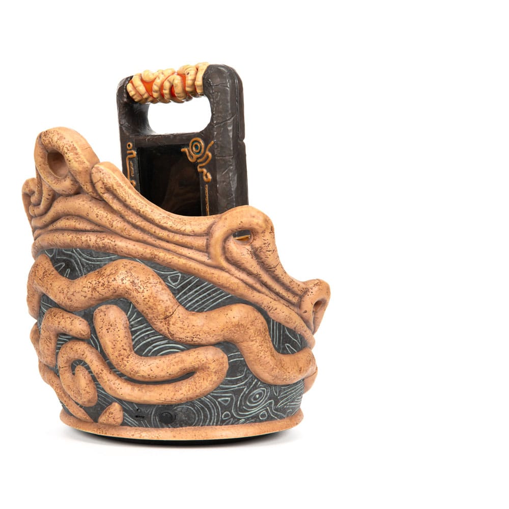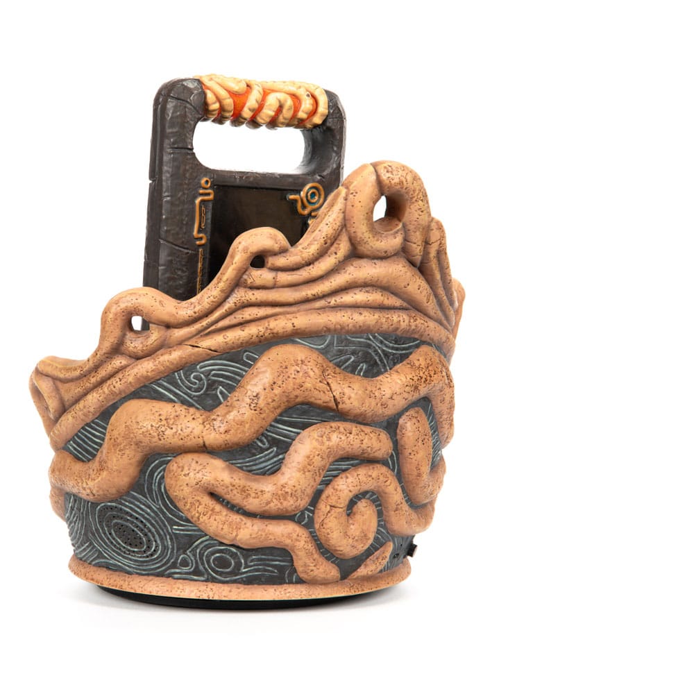 The Sheikah Slate in The Legend of Zelda: Breath of the Wild is a mystical, multifunctional tool that plays a central role in the game. As Link's indispensable device, it aids him in solving puzzles, battling foes, and exploring the vast landscapes of Hyrule. The Legend of Zelda: Breath of the Wild - Sheikah Slate statue is a life-size high-quality resin collectible. It faithfully captures the intricate details of the Sheikah Slate, from the iconic eye (the crest of the Sheikah), to the markings and tablet's texture. The tablet rests on a meticulously detailed base and can be detached.