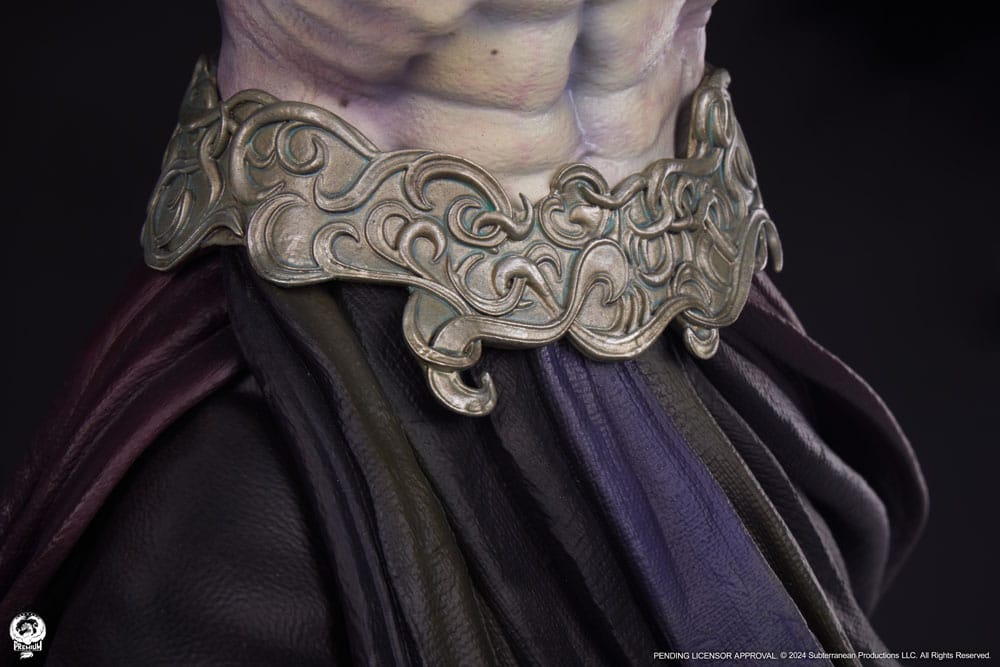 The Marcus 1:3 Statue is fully sculpted standing nearly 27" tall with an intimidating 30" wingspan. This unique vampire design is brought to stunning life with detailed sculpting capturing the musculature and supernatural vascularity of this immortal creature. Marcus' bat-like features and razor sharp teeth bring some serious severity to his ferocious expression. The life-like textures of his tattered clothing and ornate belt add yet another layer of dimension to this impressive design.