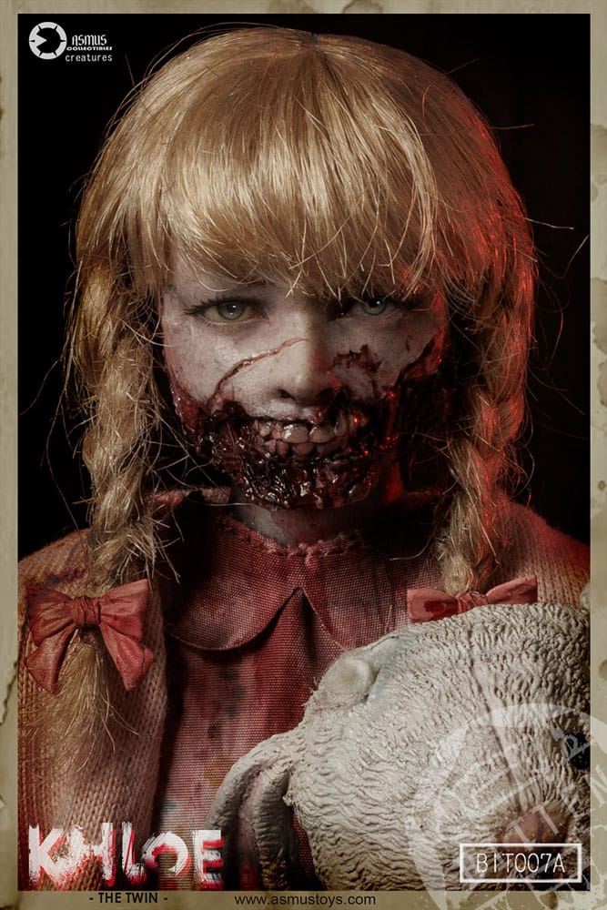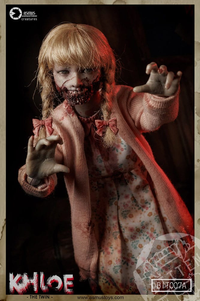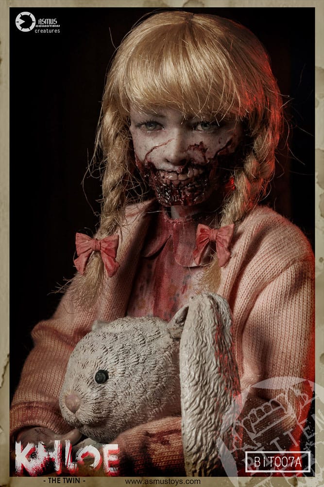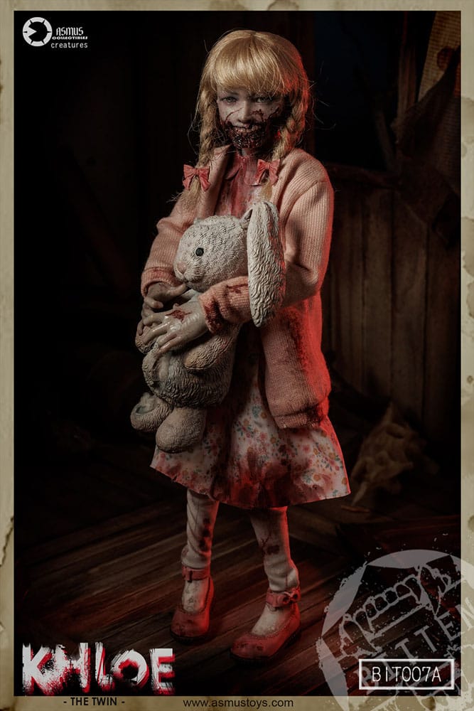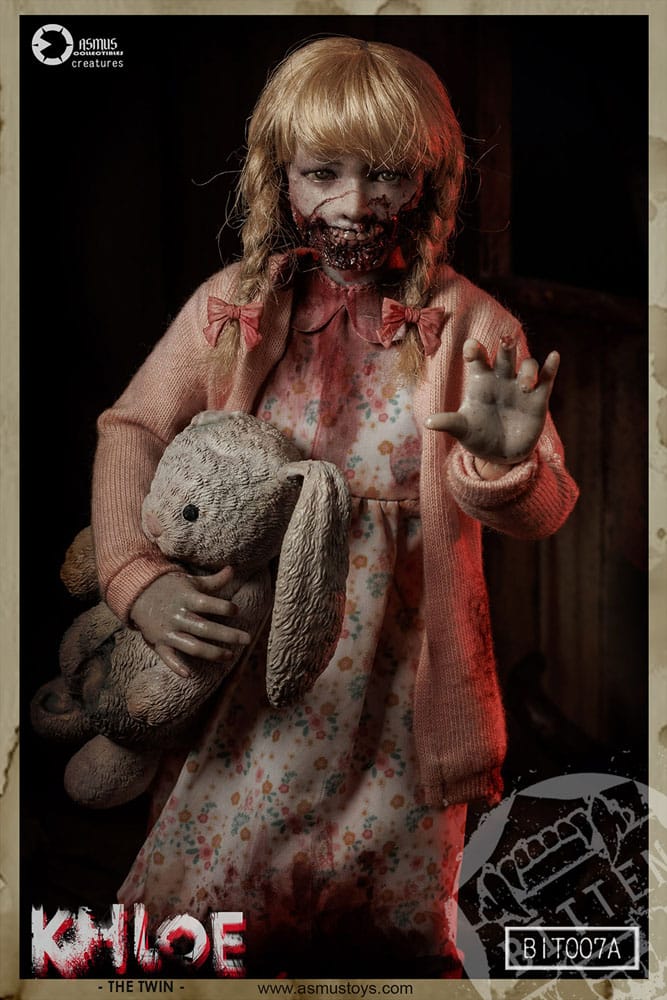 This zombie twin comes with multiple accessories inlcuding exchangable zombie hands, a diary, and her beloved bunny doll, Jesse. Don't miss your chance to add this Khloe Sixth Scale Figure to your Bitten collection today!