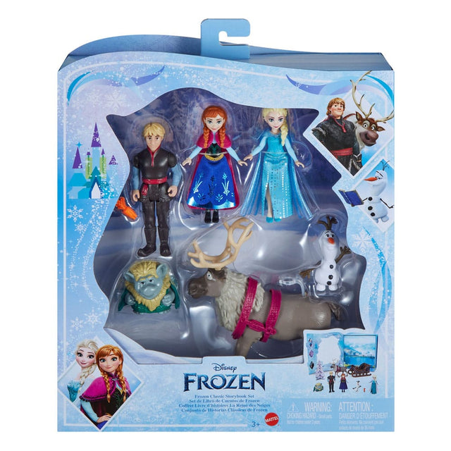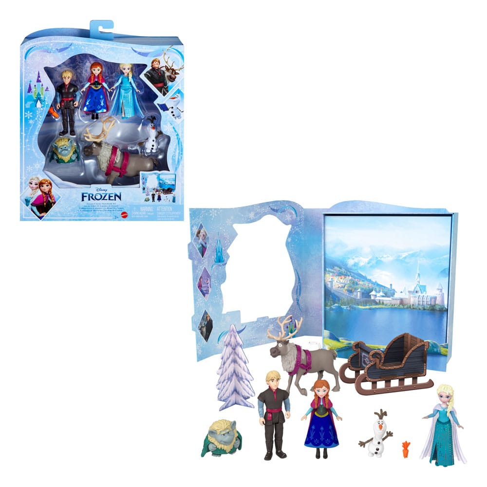 Fan-favorite movie Disney Frozen is shown with a story pack of 6 unforgettable characters, in a charming small scale! This Storybook Set includes Anna and Elsa dolls in their signature looks, Kristoff doll, Olaf figure, plus Grand Pabbie and Sven figures. The set comes in a storybook-style package with perforated play pieces that kids can pop out to expand the storytelling fun. Fans will love re-creating the story from beginning to end! Dolls cannot stand alone. Colors and decorations may vary.