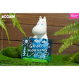 ● Moomin stands on the emerald grass, holding the blue transparent message board and peering out with curiosity.