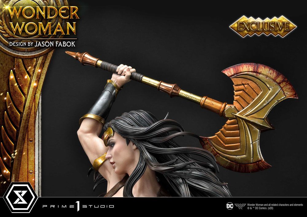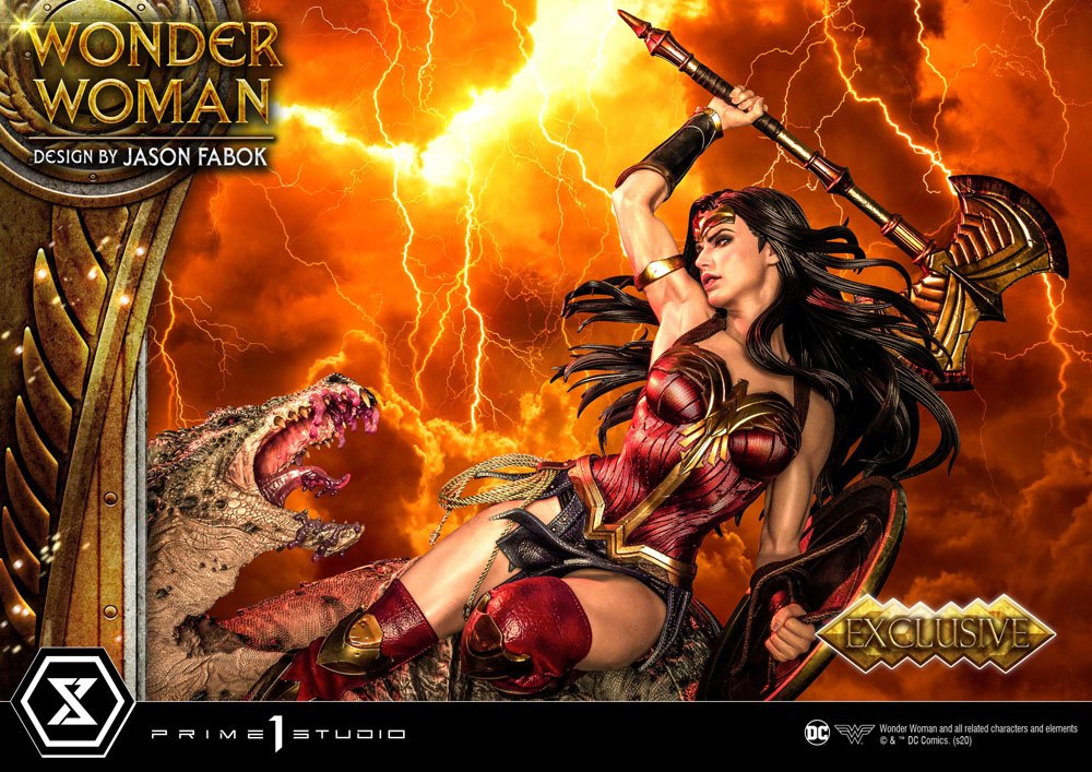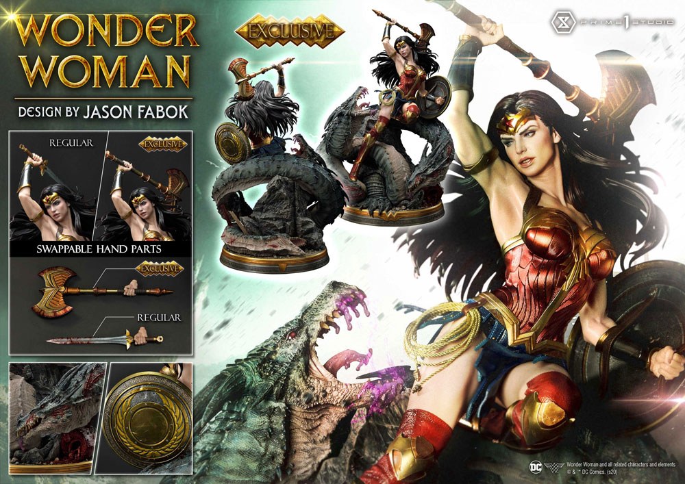 Prime 1 Studio is proud to collaborate with Comic Book Artist Jason Fabok, the latest addition to the timeless Museum Masterline Series. The highly anticipated, long-awaited 1/3 scale Amazonian Princess: Wonder Woman Vs. Hydra. The daughter of the mighty Olympian God Zeus and the Queen of the Amazons, Hippolyta, Princess Diana of Themyscira is the embodiment of power and heroism. She possesses superhuman strength, speed, advanced hand-to-hand combat, and is proficient with nearly every weapon ever made, including her very own Lasso of Truth. Wonder Woman is locked into battle with the Three-Headed Hydra. She is in a dynamic attack pose, weapon in hand, armor beautifully glistening, with an extremely focused, determined look on her face. Her hair is flowing in the wind as she is locked in to strike the insanely detailed Three-Headed Hydra. The Hydra has already felt Diana's blade once and has some noticeable battle damage. Its open mouth is leaking with venom, and its eyes are poised on Wonder Woman, you can feel the tension through the statue! Through close collaboration with Jason Fabok, we have created the ultimate Wonder Woman statue in her dynamic pose. Wonder Woman's armor has been beautifully crafted with wings and feather motif. The Hydras have been sculpted in such a detailed way that you will not want to take your eyes off them! There is blood around the entire statue, adding to the atmosphere and showing you not to mess with Wonder Woman! These elements have been merged into a fully immersive piece that fully portrays Wonder Woman as the Heroine she is. Do not miss out on adding this godly masterpiece to your collection! A must-have for Wonder Woman fans everywhere! Features: ·Statue Size approx. 81 x 59 x 46 cm tall holding Sword ·Statue Size approx. 82 x 59 x 46 cm tall holding Exclusive Axe ·Statue Size approx. 90 x 59 x 46 cm tall holding EX Bonus Spear ·One (1) designed theme base ·One (1) swappable Right-Hand holding the Sword of Athena ·One (1) swappable Right-Hand holding the Battle Axe [Exclusive Version Only] ·One (1) swappable Right-Hand holding the Bonus Spear [Exclusive Bonus Version Only] Please note: Due to the size of this item, additional shipping costs may apply. Apart from your location, the actual package size and weight is needed to determine those costs. Both are unknown at this point and may not be available until the product arrives in our warehouse.